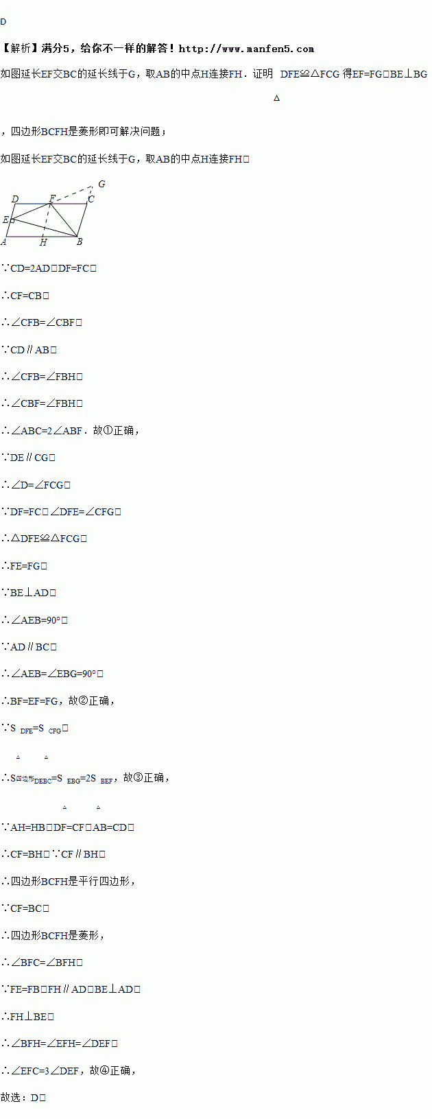 如图,在 ABCD中,CD=2AD,BE⊥AD于点E,F为DC的中点,连结EF、BF,下列结论:①∠ABC=2∠ABF;②EF=BF;③S四边形DEBC=2S△EFB;④∠CFE=3∠DEF,其中正确结论的个数共有( ).
