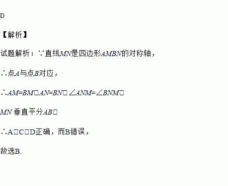 如图,直线MN是四边形AMBN的对称轴,点P是直线MN上的点,下列判断错误的是( )