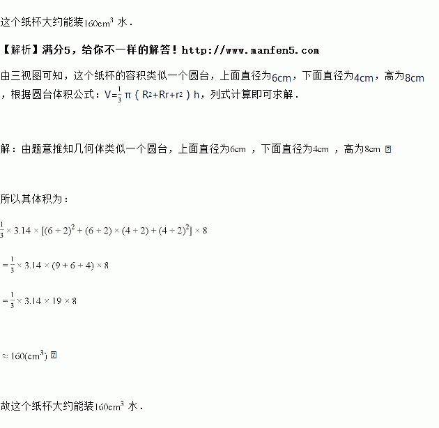 如图是一个纸杯的三视图,你能计算出这个纸杯能装多少水吗?(不计纸的厚度,取,结果取整数)
