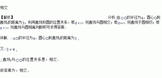 ⊙O的半径为4,圆心O到直线的距离为3,则直线与⊙O的位置关系是_____.