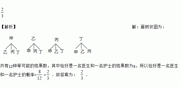 【解析】【解析】 画树状图为: 共有12种等可能的结果数,其中恰好是一名医生和一名护士的结果数为8,所以恰好是一名医生和一名护士的概率==.故答案为: .