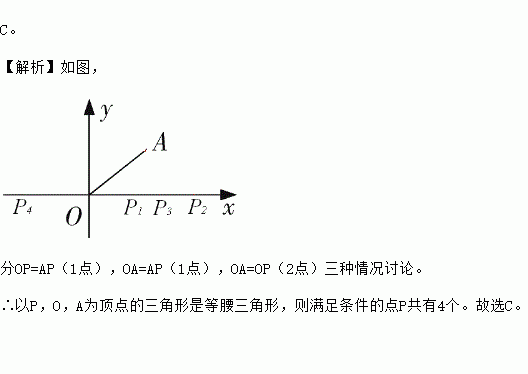 如图,在平面直角坐标系中,点A在第一象限,点P在x轴上,若以P,O,A为顶点的三角形是等腰三角形,则满足条件的点P共有【 】