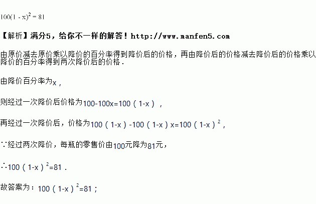某药品经过两次降价,每盒零售价由元降为元,设平均每次降价的百分率为,那么根据题意,可以列出关于的方程是________.
