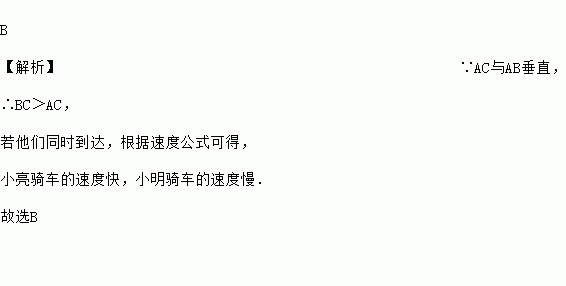 B 【解析】∵AC与AB垂直, ∴BC>AC, 若他们同时到达,根据速度公式可得, 小亮骑车的速度快,小明骑车的速度慢. 故选B