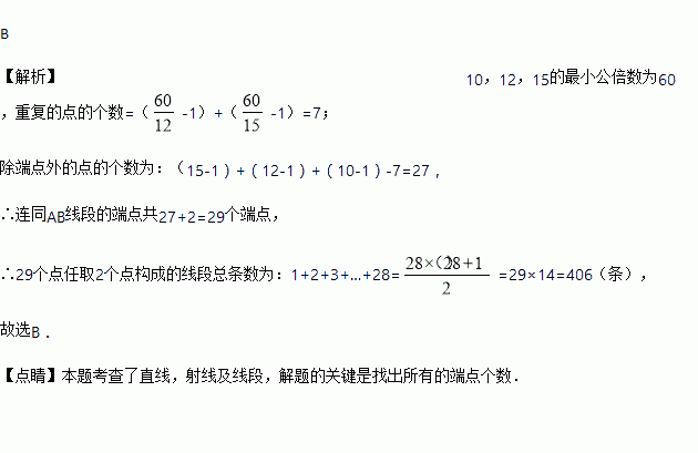 在线段AB上选取3种点,第一种是将AB进行10等分的点;第2种是将AB进行12等分的点;第三种是将AB进行15等分的点,这些点连同线段AB的端点可组成线段的条数是( )