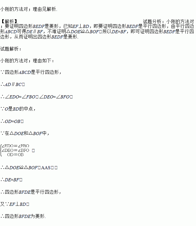 已知ABCD为平行四边形纸片,要想用它剪成一个菱形,小刚说只要过BD中点作BD的垂线交AD、BC于E、F,沿BE、DF剪去两个角,所得的四边形BFDE为菱形.你认为小刚的方法对吗?为什么?