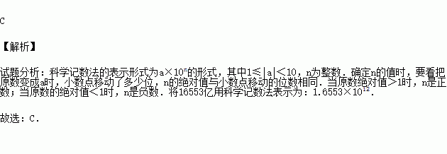 从新华网获悉:商务部5月27日发布的数据显示,一季度,中国与“一带一路”沿线国家在经贸合作领域保持良好发展势头,双边货物贸易总额超过16553亿元人民币.16553亿用科学记数法表示为( )