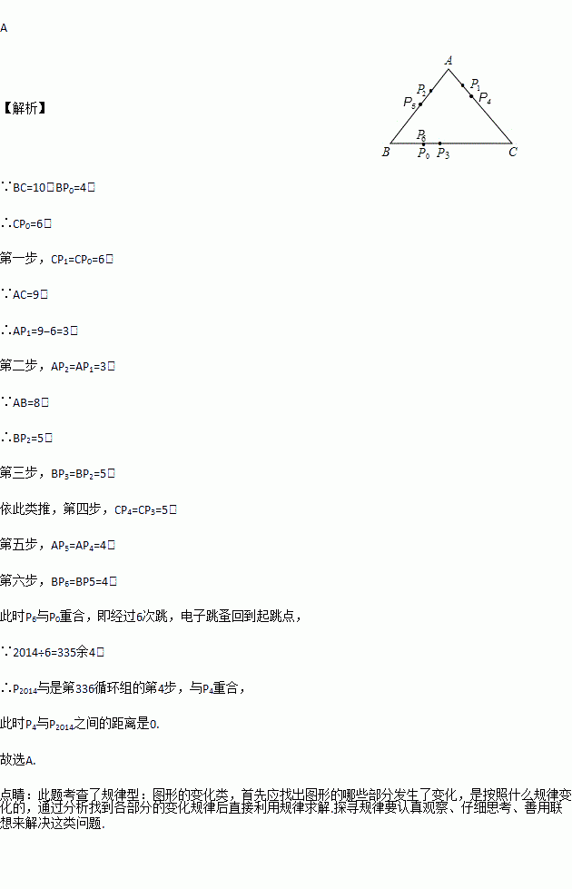 电子跳蚤游戏盘(如图)为△ABC,AB=8,AC=9,BC=10,如果电子跳蚤开始时在BC边的P0点,BP0=4,第一步跳蚤从P0跳到AC边上P1点,且CP1=CP0;第二步跳蚤从P1跳到AB边上P2 点,且AP1=AP2 ;第三步跳蚤从P2跳回到BC边上P3点,且BP3=BP2;……跳蚤按上述规则跳下去,第