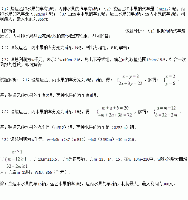 (1)用8辆汽车装运乙、丙两种水果共22吨到A地销售,问装运乙、丙两种水果的汽车各多少辆?