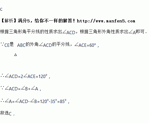 如图,CE 是△ABC 的外角∠ACD 的平分线,若∠B=35°,∠ACE=60°,则∠A=( )