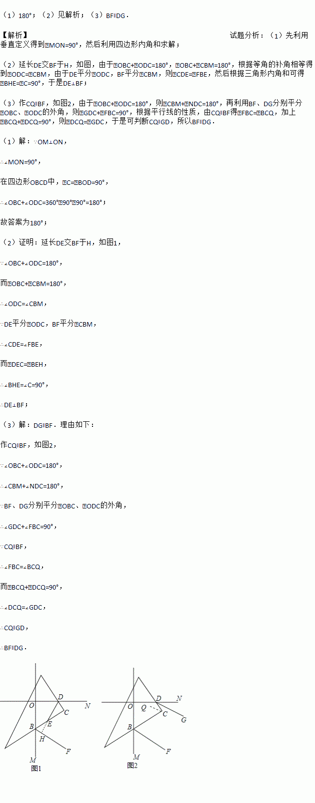 (3)如图2:若BF、DG分别平分∠OBC、∠ODC的外角,判断BF与DG的位置关系,并说明理由。