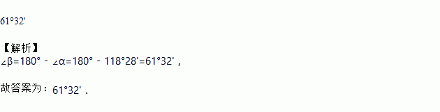 如果我们将一副三角尺按如图所示的位置摆放,并且已知∠α=118°28',那么∠β的度数为_____.