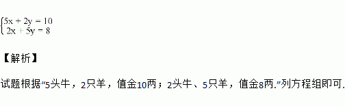 译文:“假设有5头牛、2只羊,值金10两;2头牛、5只羊,值金8两.问:每头牛、每只羊各值金多少两?”