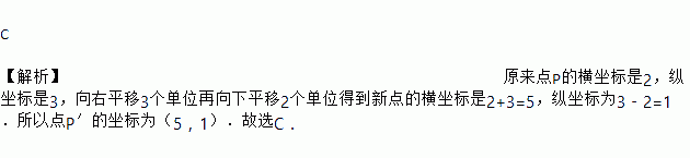 C 【解析】原来点P的横坐标是2,纵坐标是3,向右平移3个单位再向下平移2个单位得到新点的横坐标是2+3=5,纵坐标为3﹣2=1.所以点P′的坐标为(5,1).故选C.