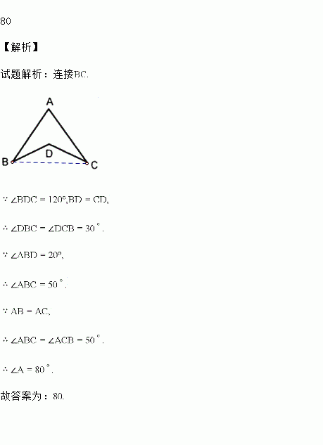 如图,若AB=AC,BD=CD,∠B=20°,∠BDC=120°,则∠A=________.