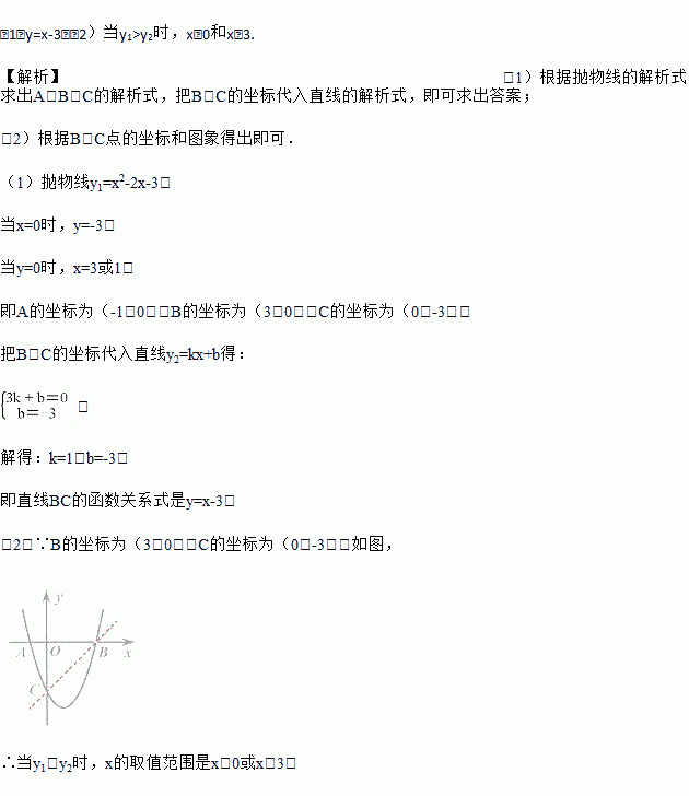 如图,已知抛物线y1=x2-2x-3与x轴相交于点A,B(点A在B的左侧),与y轴相交于点C,直线y2=kx+b经过点B,C.