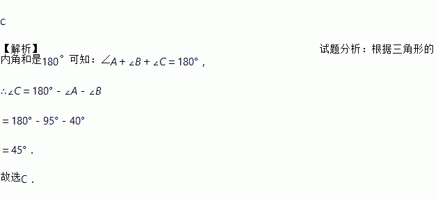 C 【解析】试题分析:根据三角形的内角和是180°可知:∠A+∠B+∠C=180°, ∴∠C=180°-∠A-∠B =180°-95°-40° =45°. 故选C.