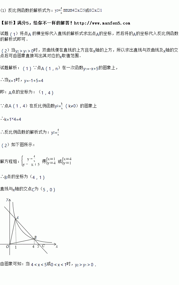 如图,一次函数y1=﹣x+5的图象与反比例函数y2=