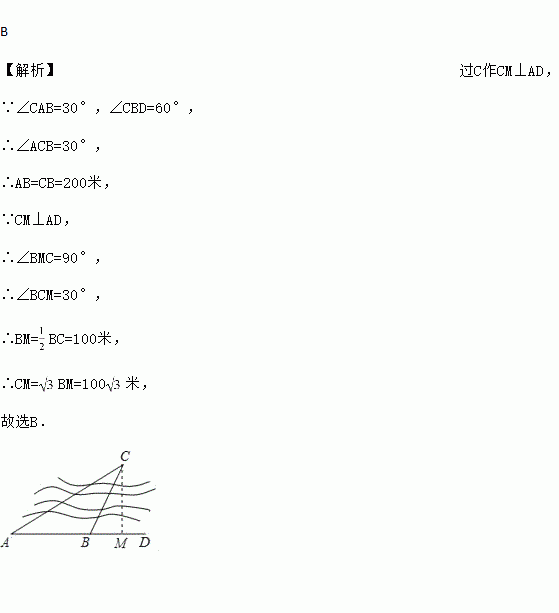 如图,要测量凉亭C到河岸AD的距离,在河岸相距200米的A,B两点,分别测得∠CAB=30°,∠CBD=60°,则凉亭C到河岸AD的距离为( )