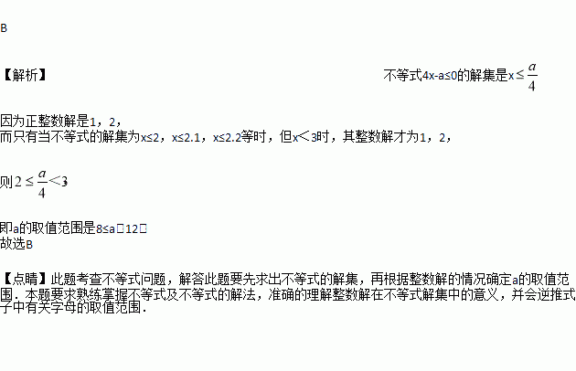 已知不等式4x-a≤0的正整数解是1,2,则a的取值范围是( )