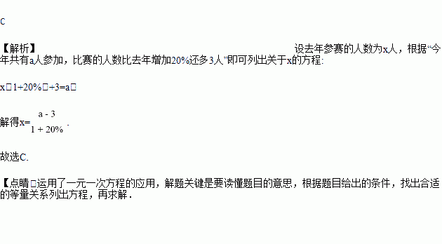 2016年“中国新歌声”大赛共有a人参加,比赛的人数比去年增加 20%还多3人,设去年参赛的人数为x人,则x为( )