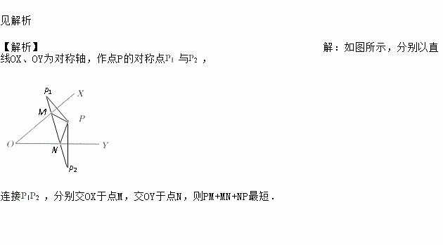 如图,∠XOY内有一点P,试在射线OX上找出一点M,在射线OY上找出一点N,使PM+MN+NP最短.