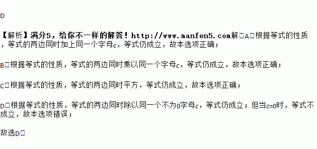 A. a+c=b+c B. ac=bc C. a2=b2 D. ![]()