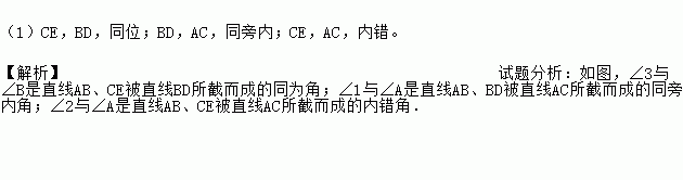 如图,∠3与∠B是直线AB、______被直线______所截而成的______角;∠1与∠A是直线AB、______被直线______所截而成的______角;∠2与∠A是直线AB、______被直线______所截而成的______角。