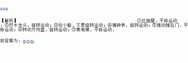 ②④⑥ 【解析】①拉抽屉,平移运动;②拧水龙头,旋转运动;③划小船,不是旋转运动;④调钟表,旋转运动;⑤推动推拉门,平移运动;⑥转动方向盘,旋转运动;⑦乘电梯,平移运动, 故答案为:②④⑥.