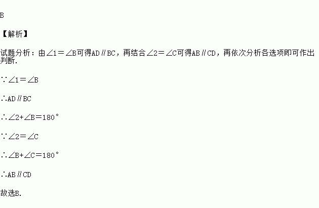 B 【解析】 试题分析:由∠1=∠B可得AD∥BC,再结合∠2=∠C可得AB∥CD,再依次分析各选项即可作出判断. ∵∠1=∠B ∴AD∥BC ∴∠2+∠B=180° ∵∠2=∠C ∴∠B+∠C=180° ∴AB∥CD 故选B.