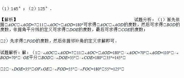 如图,两直线AB,CD相交于点O,OE平分∠BOD,∠AOC∶∠AOD=7∶11.