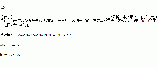 若把二次函数y=x2+6x+2化为y=(x-h)2+k的形式,其中h,k为常数,则h+k= .