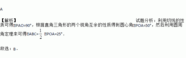 如图,AB是⊙O的直径,直线PA与⊙O相切于点A,PO交⊙O于点C,连接BC.若∠P = 40°,则∠ABC的度数为( )