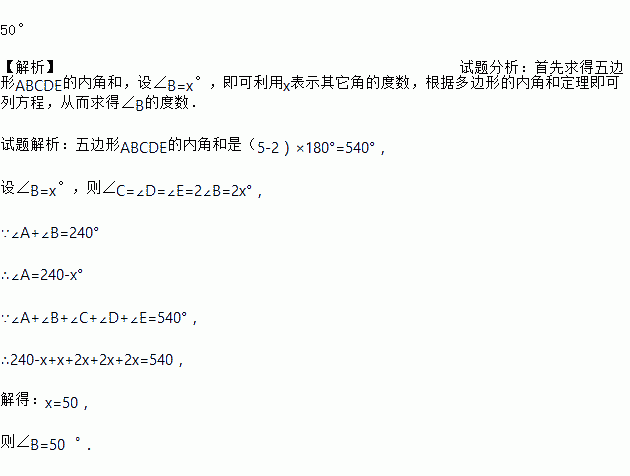 在五边形ABCDE中,∠A+∠B=240°,∠C=∠D=∠E=2∠B.求∠B的度数.