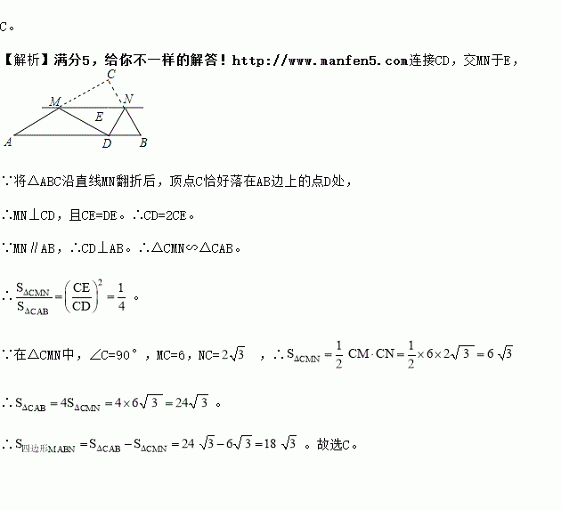 如图,在△ABC中,∠C=90°,将△ABC沿直线MN翻折后,顶点C恰好落在AB边上的点D处,已知MN∥AB,MC=6,NC=,则四边形MABN的面积是【 】