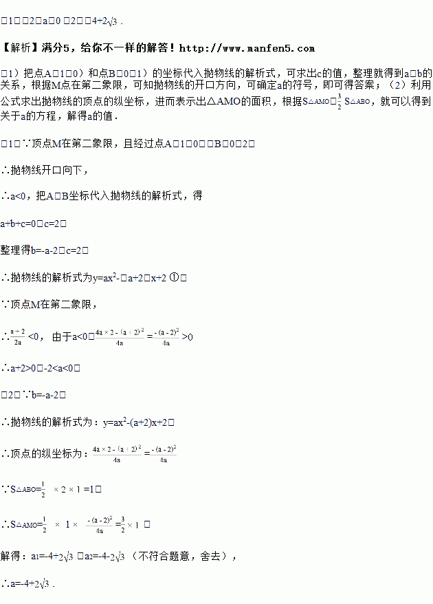 已知抛物线y=ax2+bx+c的顶点M在第二象限,且经过点 A(1,0)和点 B(0,2).则
