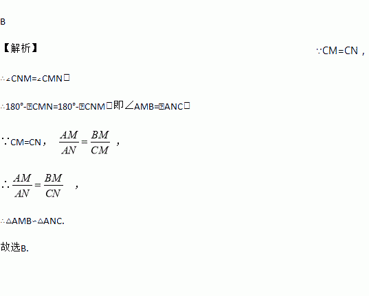 A. △ABM∽△ACB B. △ANC∽△AMB C. △ANC∽△ACM D. △CMN∽△BCA