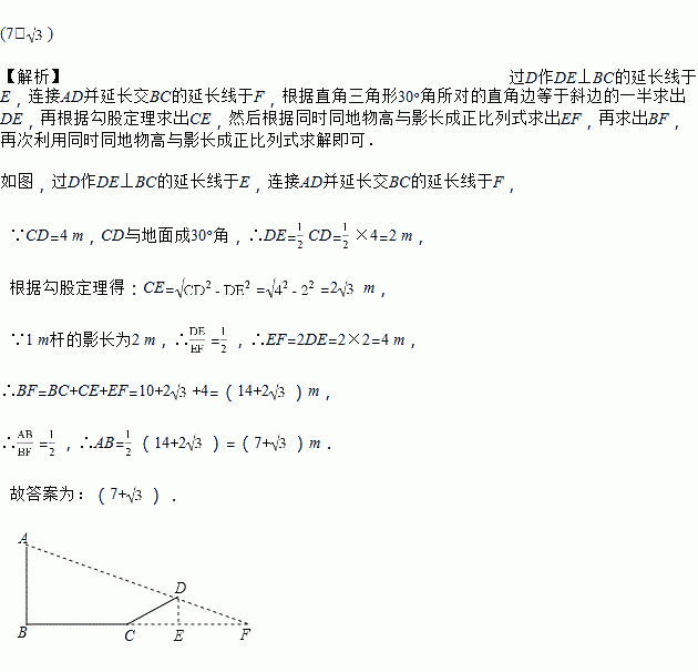 如图,数学兴趣小组想测量电线杆AB的高度,他们发现电线杆的影子恰好落在土坡的坡面CD和地面BC上,量得CD=4 m,BC=10 m,CD与地面成30°角,且此时测得高1 m的标杆的影长为2 m,则电线杆的高度为________m(结果保留根号).