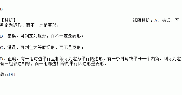 D. 有一组对边平行且相等,且有一条对角线平分一个内角