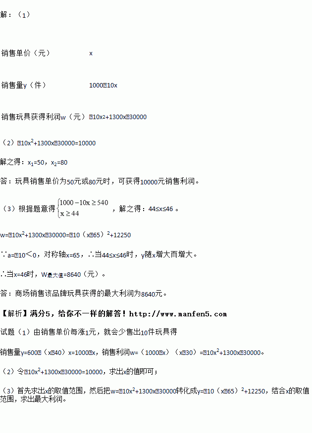 某商场经营某种品牌的玩具,购进时的单价是30元,根据市场调查:在一段时间内,销售单价是40元时,销售量是600件,而销售单价每涨1元,就会少售出10件玩具.