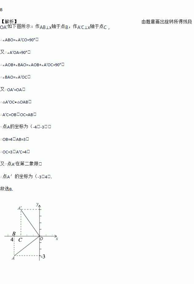 B 【解析】由题意画出旋转所得线段OA′如下图所示:作AB⊥x轴于点B,作A′C⊥x轴于点C, ∴∠ABO=∠A′CO=90°, 又∵∠A′OA=90°, ∴∠AOB+∠BAO=∠AOB+∠A′OC=90°, ∴∠BAO=∠A′OC, 又∵OA′=OA, ∴△A′OC≌△OAB, ∴A′C=OB,OC=AB, ∵点A的坐标为(-4,-3), ...