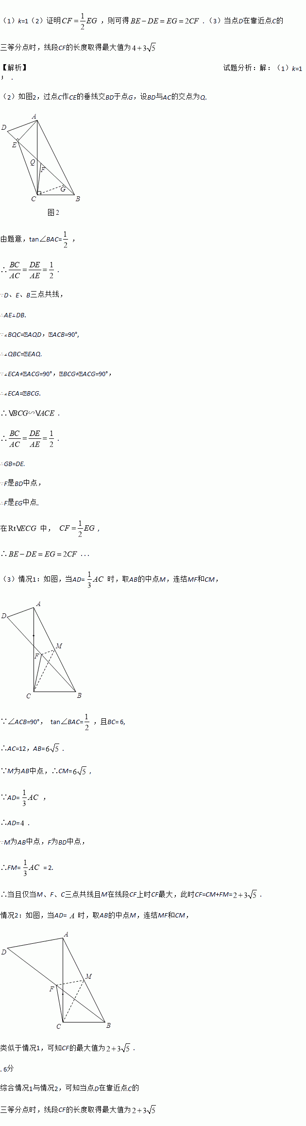 (3)若BC=6,点D在边AC的三等分点处,将线段AD绕点A旋转,点F始终为BD中点,求线段CF长度的最大值.