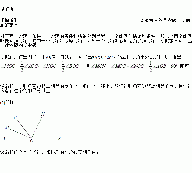 (1)“同位角相等,两直线平行”,“两直线平行,同位角相等”,这两个命题的题设和结论在命题中的位置恰好对凋,我们把其中一命题叫做另一个命题的逆命题,请你写出命题“角平分线上的点到角两边的距离相等“的逆命题,并指出逆命题的题设和结论;