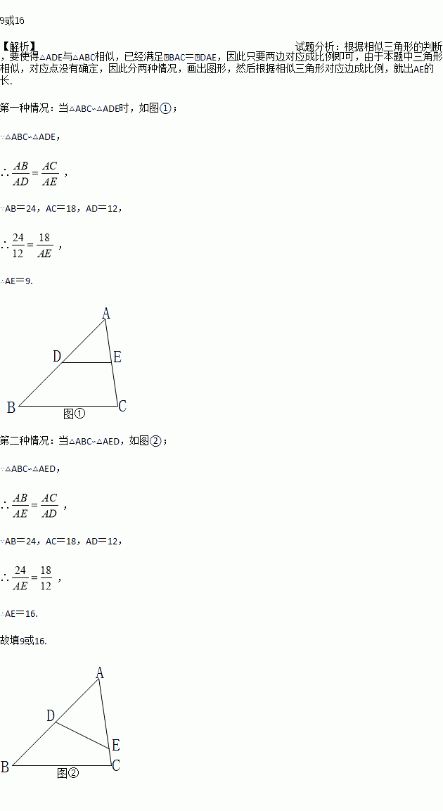 如图,在三角形ABC中,AB=24,AC=18,D是AC上一点,AD=12,在AB上取一点E,使A、D、E三点组成的三角形与ABC相似,则AE=__________.