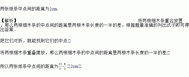 有两张纸条,一张长8cm,另一张长12cm,若不用刻度尺,你能找到它们的中点吗?将两张纸条一端对齐,重合放置,此时两张纸条中点间的距离是多少?