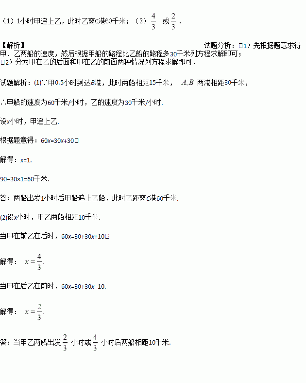 在一条直线上依次有A、B、C三个港口,A、B两港相距30千米,B、C两港相距90千米.甲、乙两船同时分别从A、B港口出发,沿直线匀速驶向C港,最终达到C港.甲0.5小时到达B港,此时两船相距15千米.