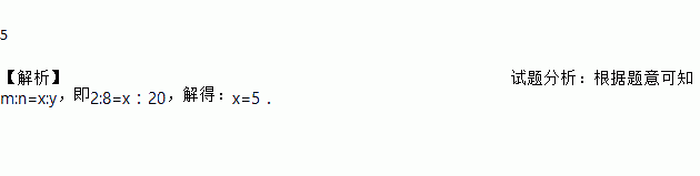 5 【解析】试题分析:根据题意可知m:n=x:y,即2:8=x:20,解得:x=5.