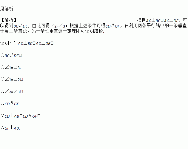 如图,DE⊥AC于点E,BC⊥AC,CD⊥AB于点D,∠1=∠2,求证:GF⊥AB.
