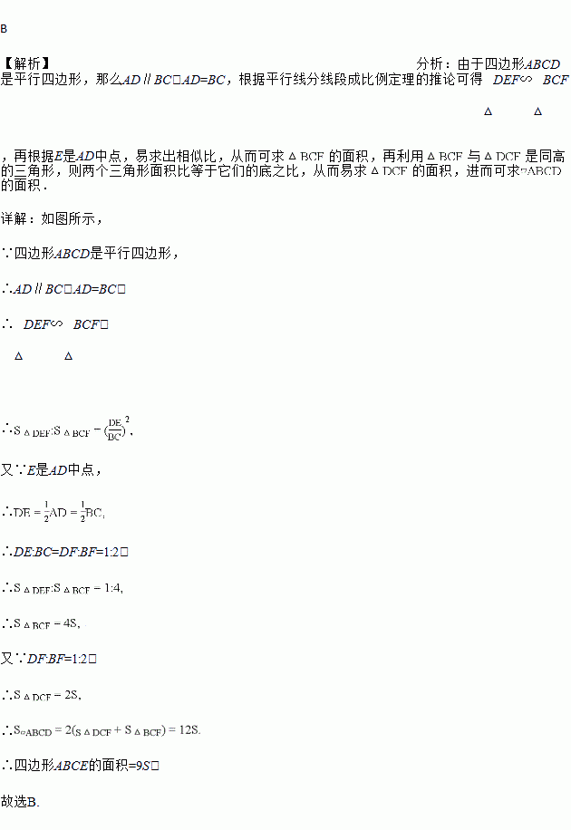 如图,平行四边形ABCD中,E为AD的中点,已知△DEF的面积为S,则四边形ABCE的面积为( )