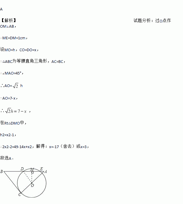 如图,将一块等腰Rt△ABC的直角顶点C放在⊙O上,绕点C旋转三角形,使边AC经过圆心O,某一时刻,斜边AB在⊙O上截得的线段DE=2cm,且BC=7cm,则OC的长为( )